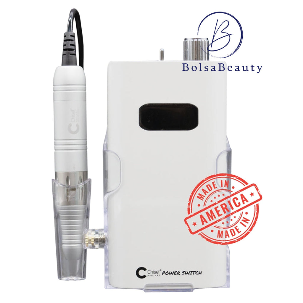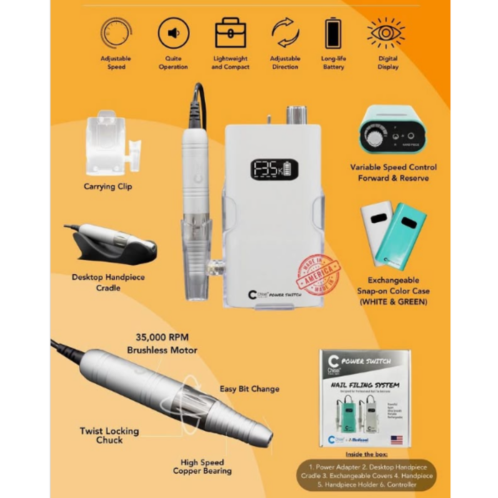 The Chisel Power SWITCH is a professional and rechargeable manicure-pedicure filing system. Its cordless, rechargeable design allows for convenient portability, making it a versatile filing system for any workstation, or it clips conveniently to your belt or pocket, allowing freedom of movement.