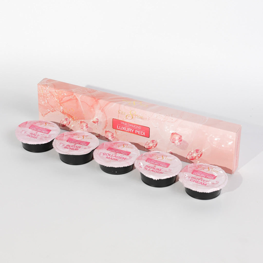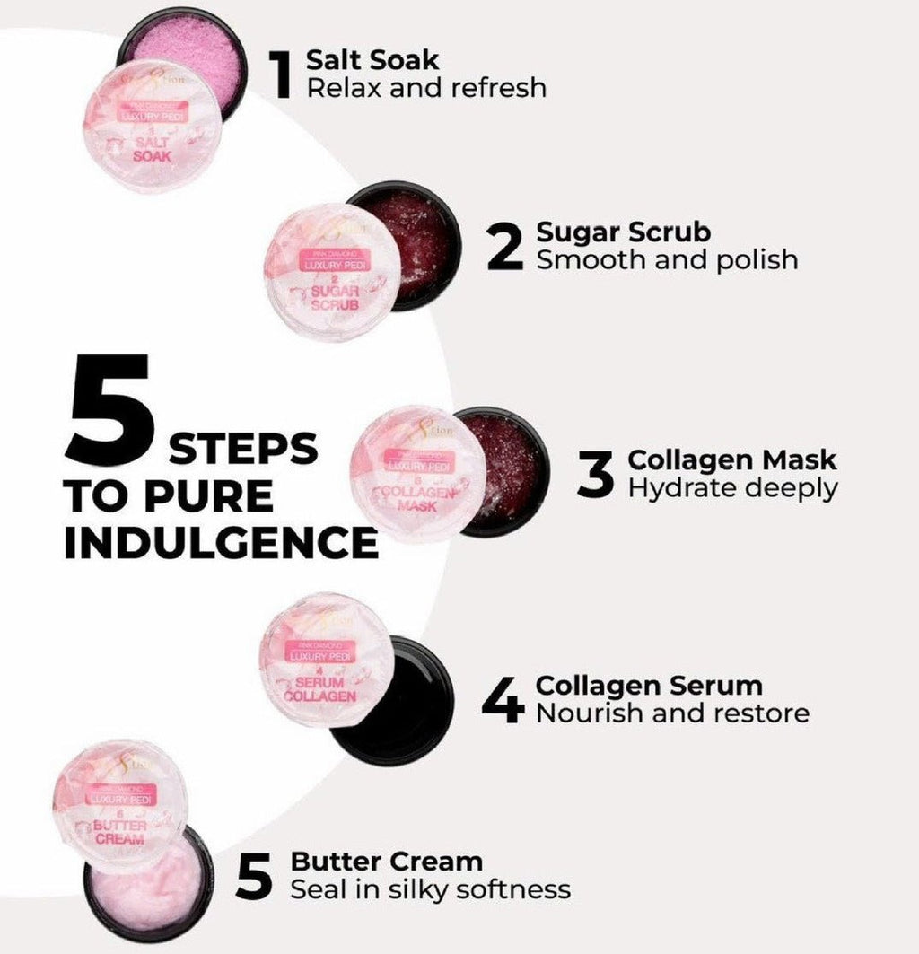 1 - Salt Soak2 - Sugar Scrub3 - Collagen Mask4 - Serum Collagen5 - Butter Cream